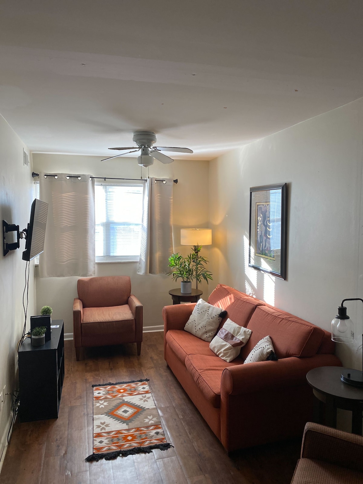 ColumbusThis cozy one bedroom apartment for 4 guests is situated on the corner of High St & Chittenden Ave - just 300ft from Ohio State campus. Avoid the campus parking headache with our one free parking spot. Enjoy the updated full kitchen, 55" Smart TV, high-speed internet, queen bed, and pull-out couch. Located on the top floor of a large brick apt building - expect noise from students nearby especially on nights/weekends.