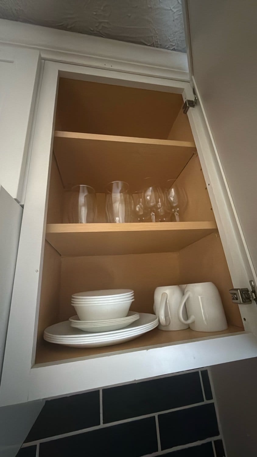 Everything you need including a fridge/freezer, a microwave, a small oven, and a stove along with utensils, cookware and a breakfast bar for two.