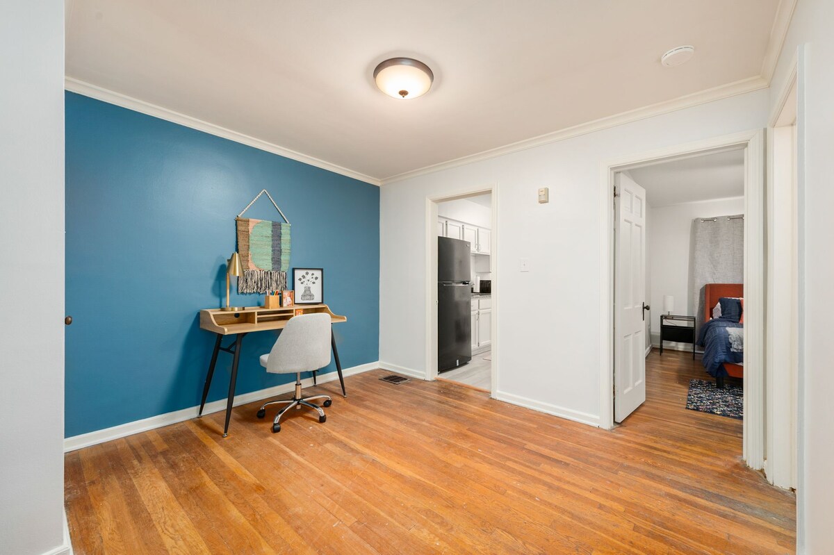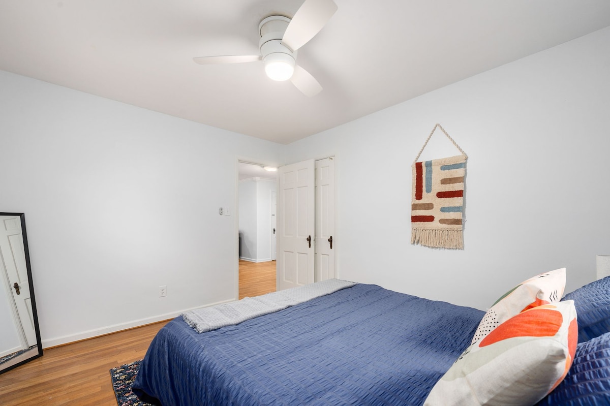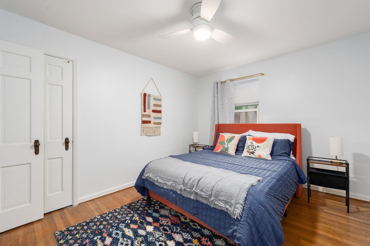 The bedroom offers a vivid pop of color with a beautiful queen bed topped with soft linen and plenty of closet space for you to unpack and make yourself at home.